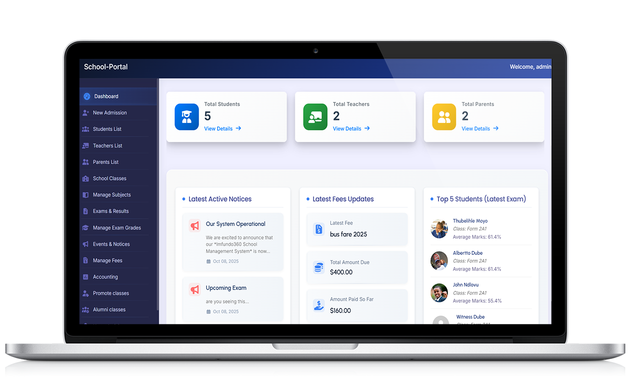 Imfundo360 is a transformative platform by Bert Plus Enterprises Pvt Ltd in Bulawayo to address the unique challenges and opportunities within Zimbabwean education. It offers schools an all-in-one system that combines local understanding with global technological standards, allowing them to streamline administration, support learners more effectively, and stay connected with families and communitiesS